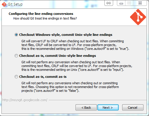 Windows Command Prompt에서 Unix 명령어까지 사용하나 윈도우 실행파일이 변경됨다음 화면에서 line encoding방식을 선택하고 Next 버튼을 클릭한다.